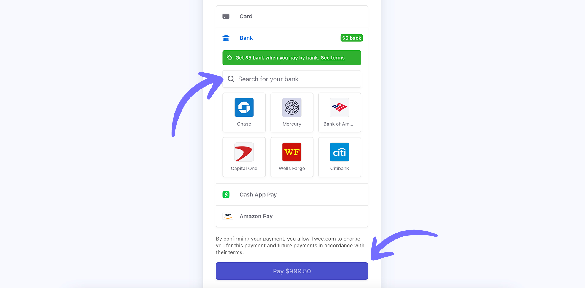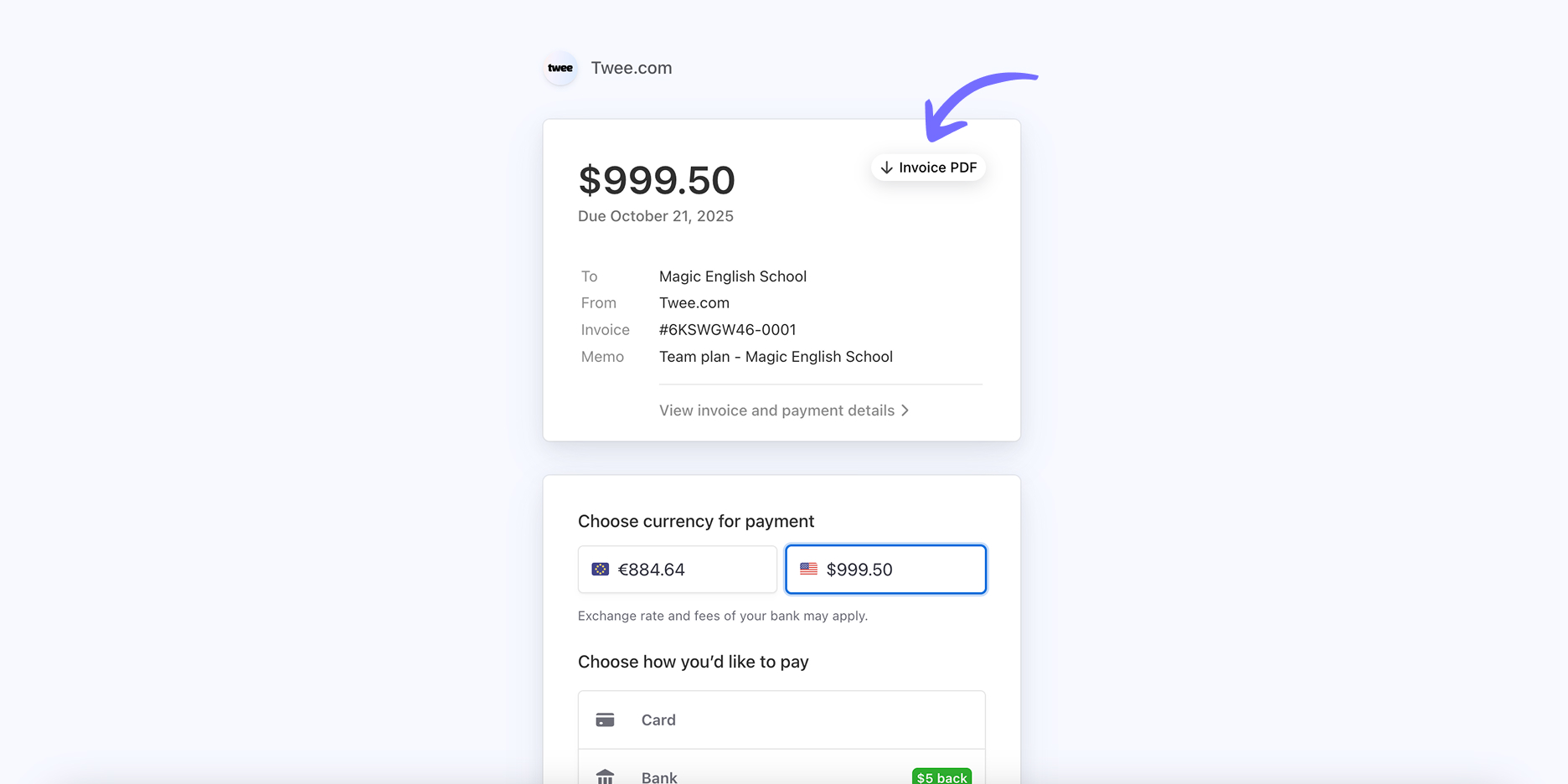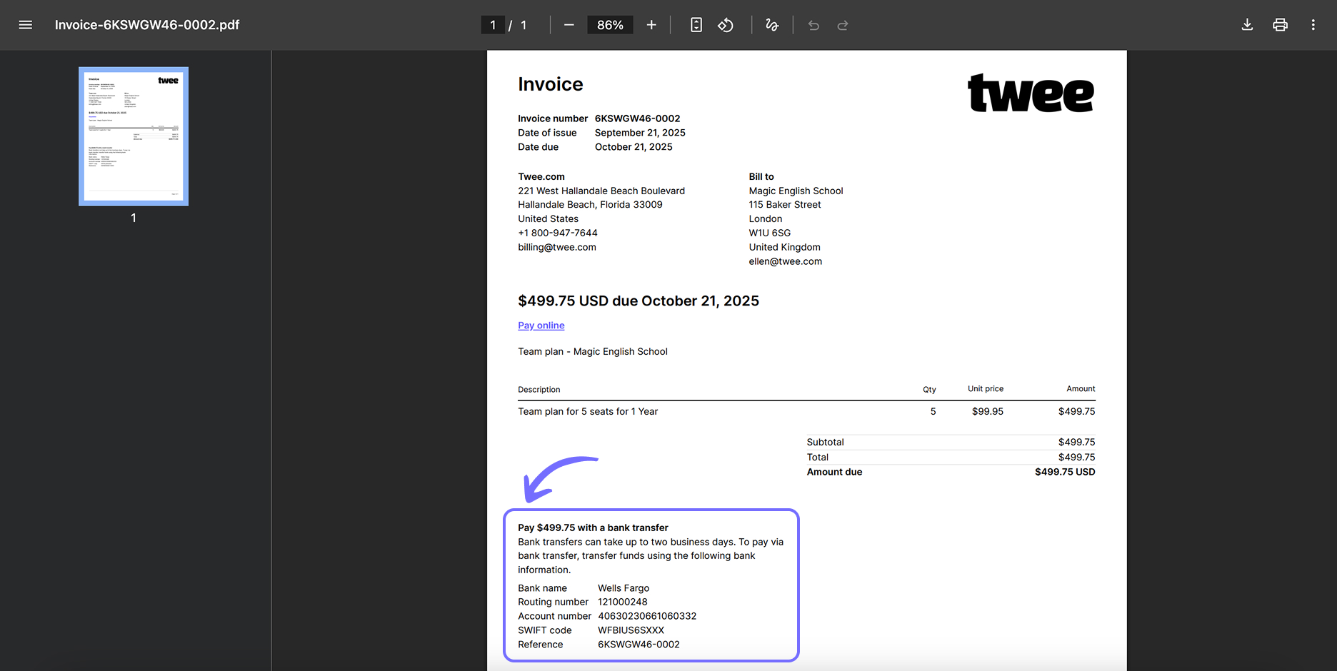 Click Create Invoice. Once it opens, you will see an option to pay via bank transfer among the available payment options. Search for your bank here.