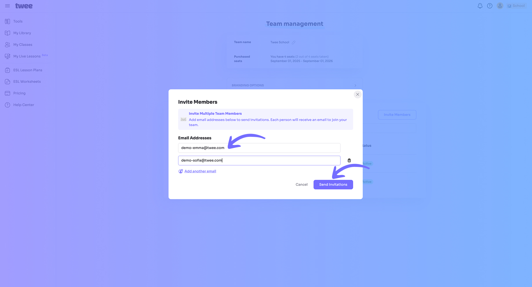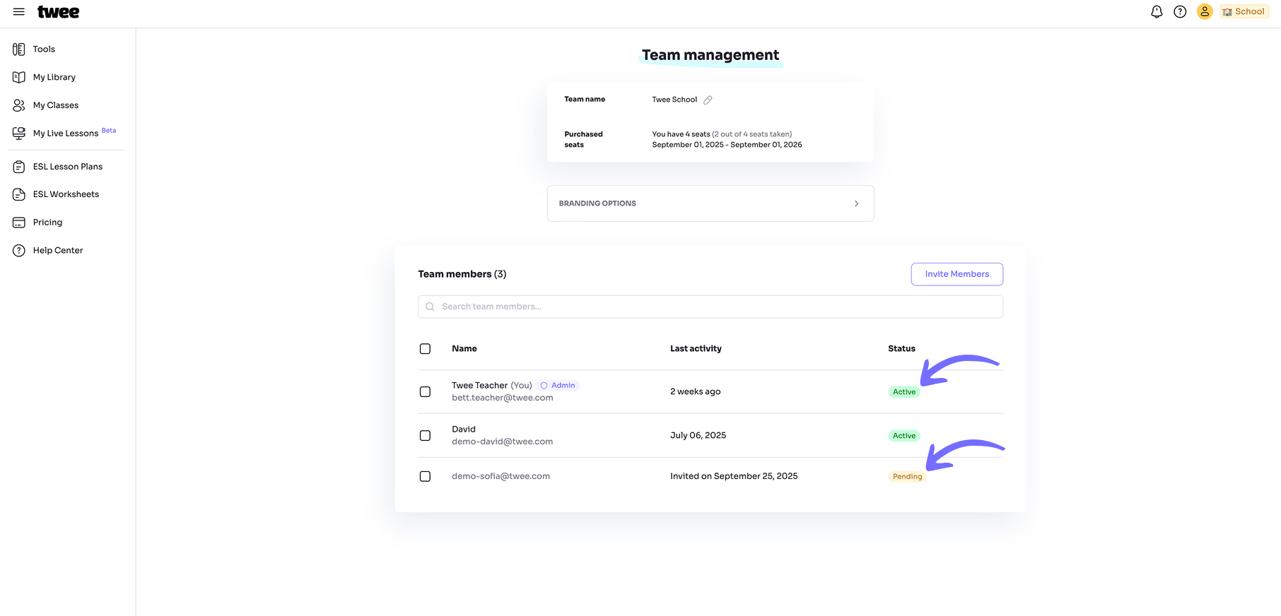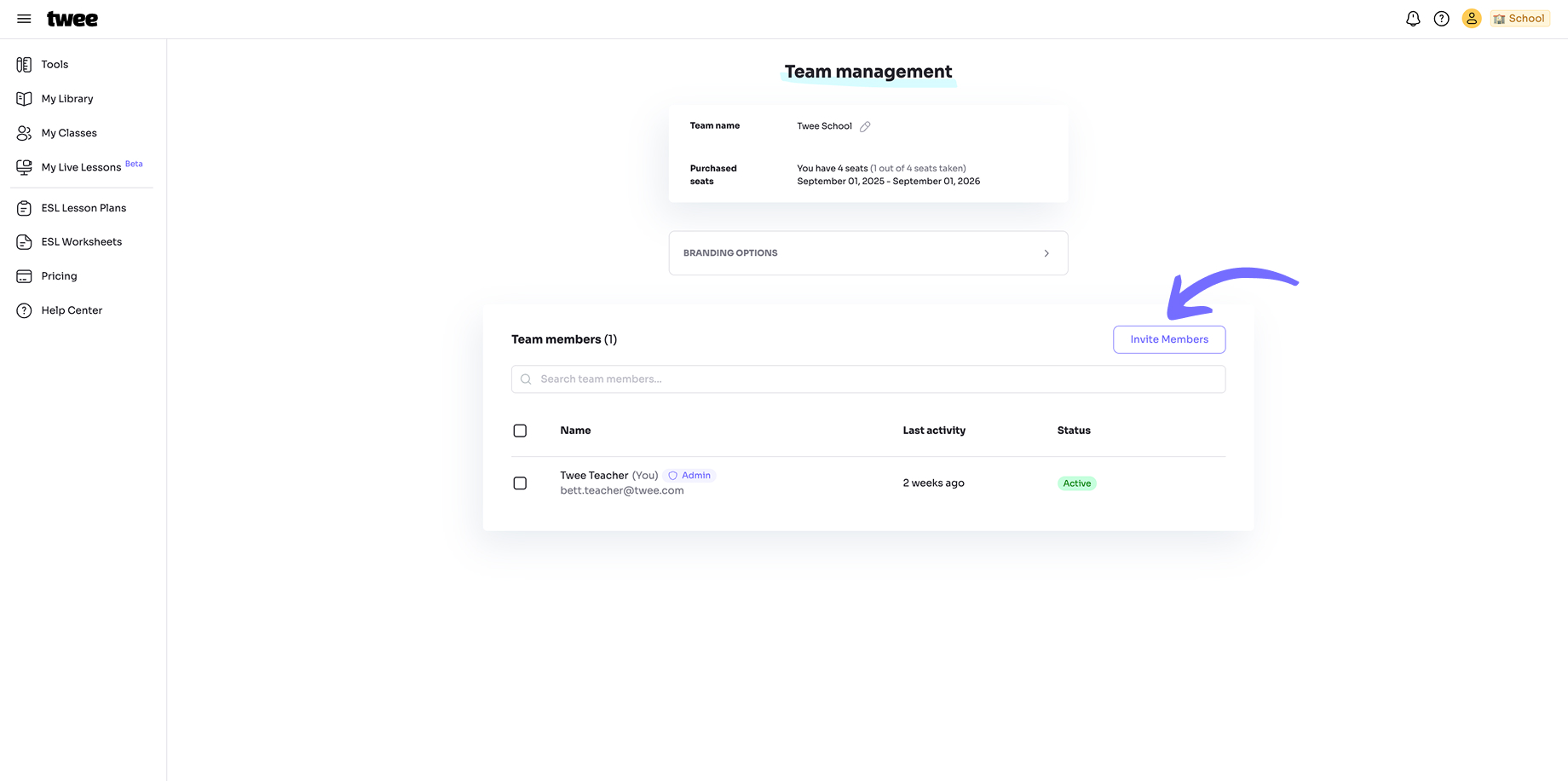 At the top of the screen, you will see your school’s name and the number of seats available. Below, there is a list of team members. To invite more members, click the Invite Members button on the right.