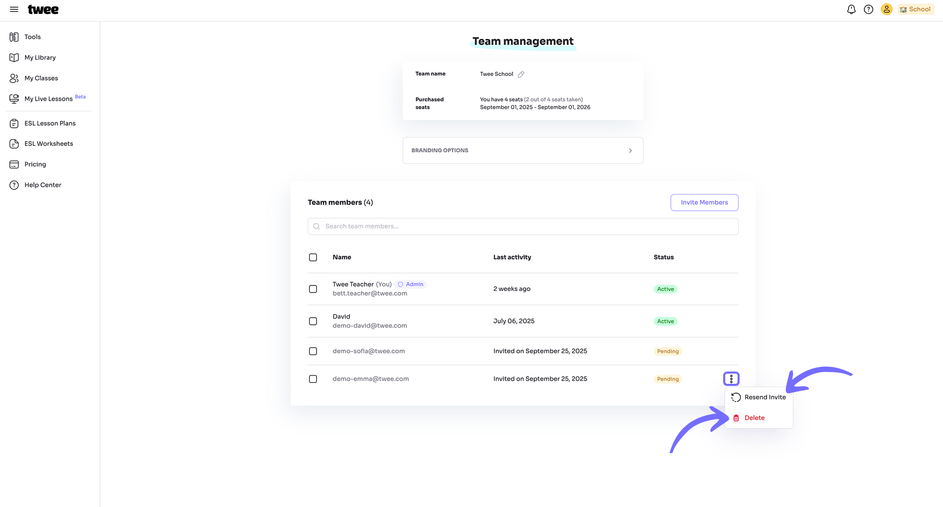 If a team member missed the invitation or can’t find it, you can resend it. Click on the three dots next to their status and select Resend Invite.