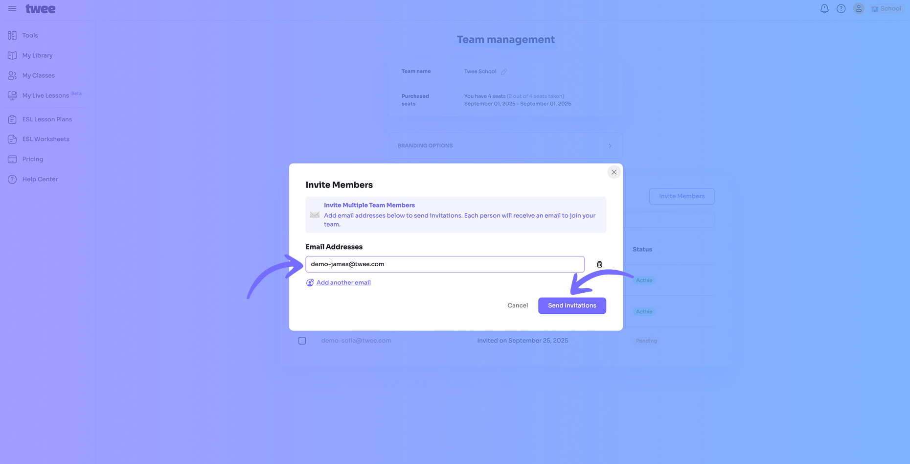 Click Invite Member to invite the new teacher. Enter their email address and click Send Invitations.