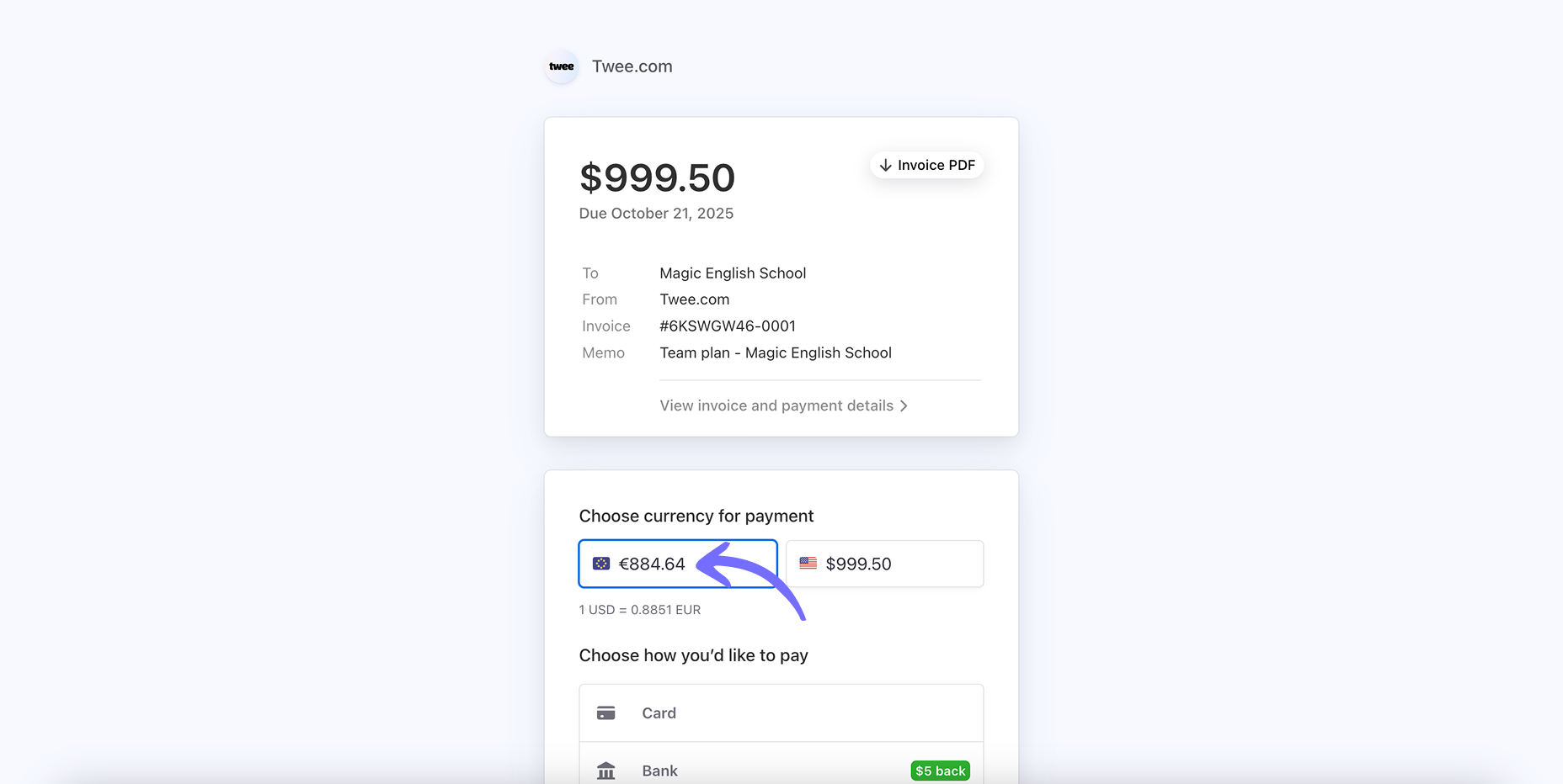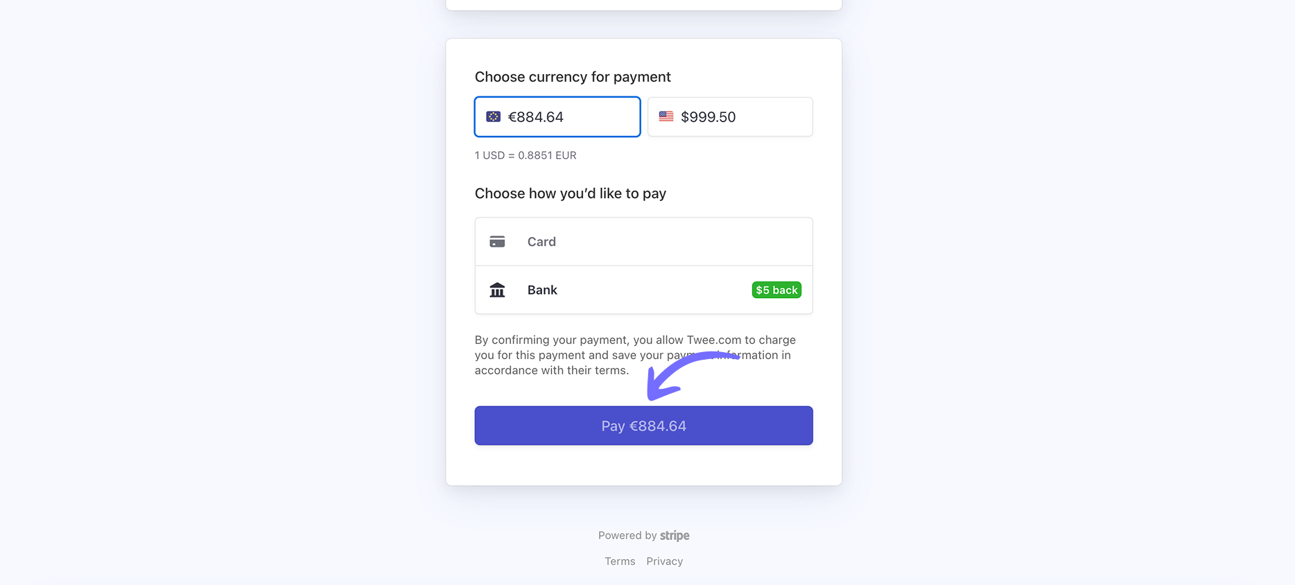 Once it opens, you will see an option to choose the payment currency and view the exact amount in that currency.