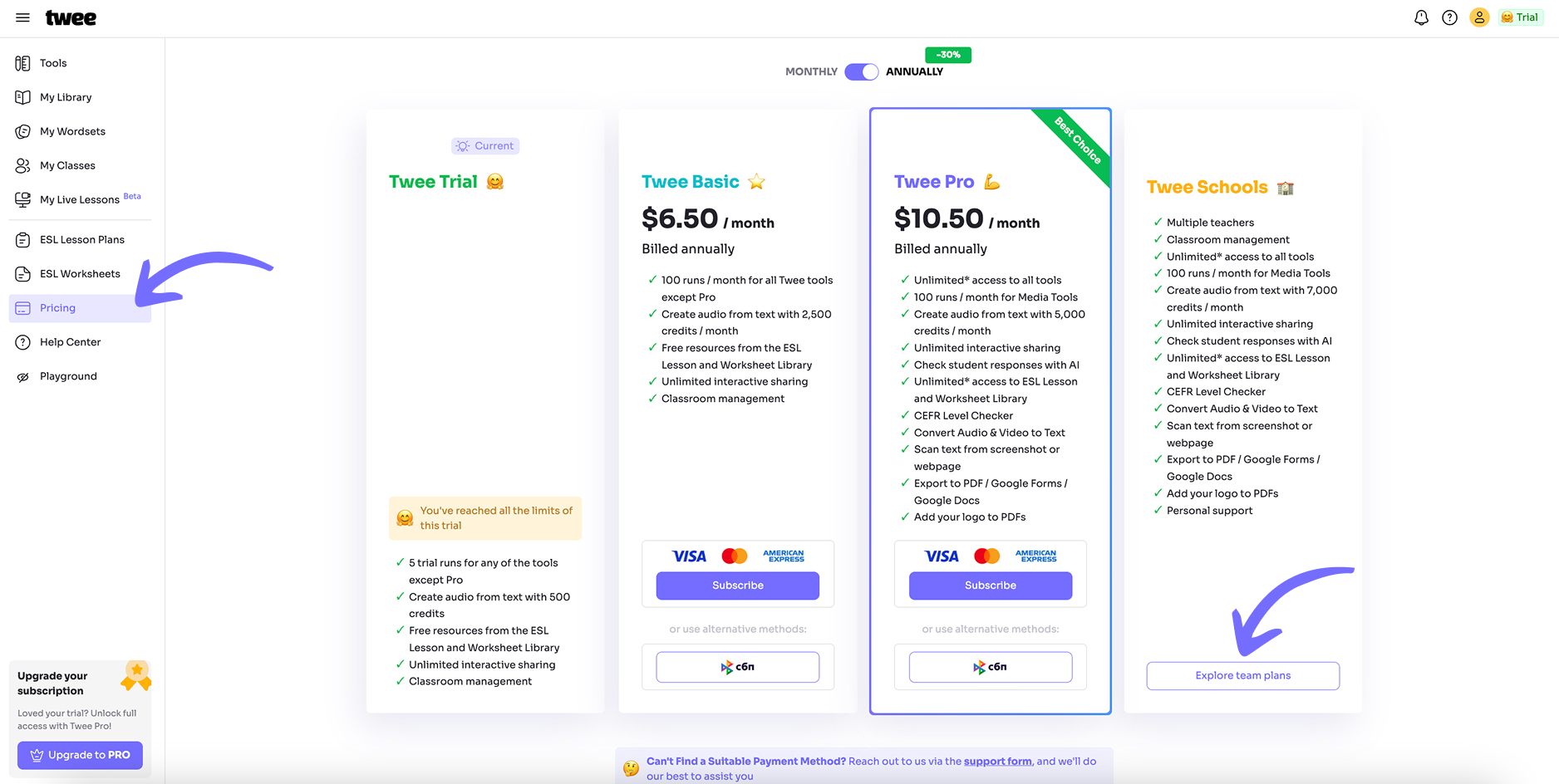 Go to the Pricing page by clicking on it in the left-side menu. Find Twee Schools and click Explore Team Plans.