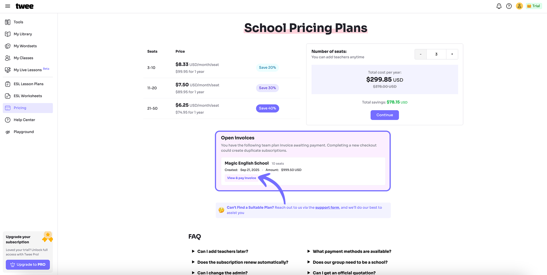 You will be taken to the School Pricing Plans page, where you can see all your open invoices. Select the invoice you need and click View & Pay to proceed.