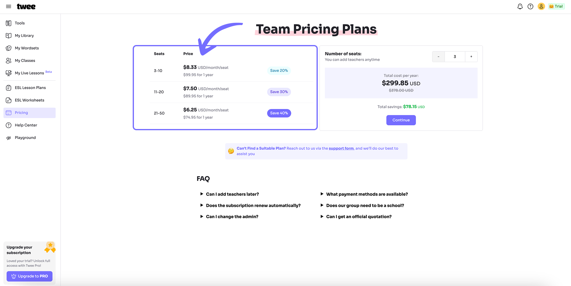 You will be taken to the page with Team Pricing Plans, where you can see the monthly (and annual) cost per teacher depending on the number of teachers (shown on the left).